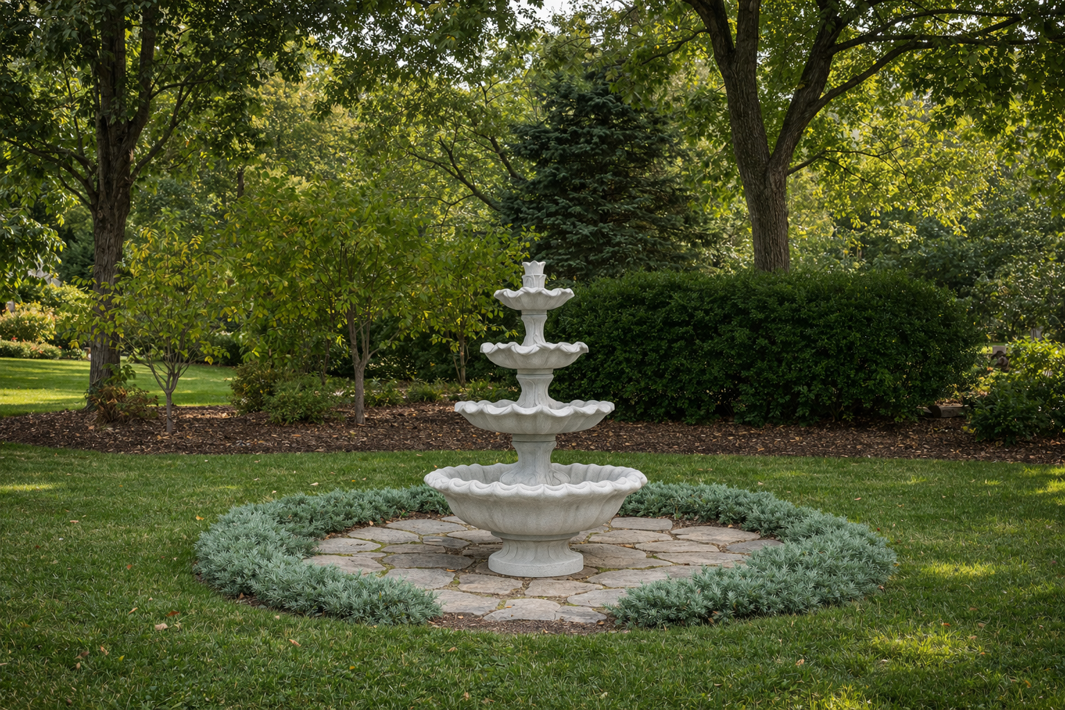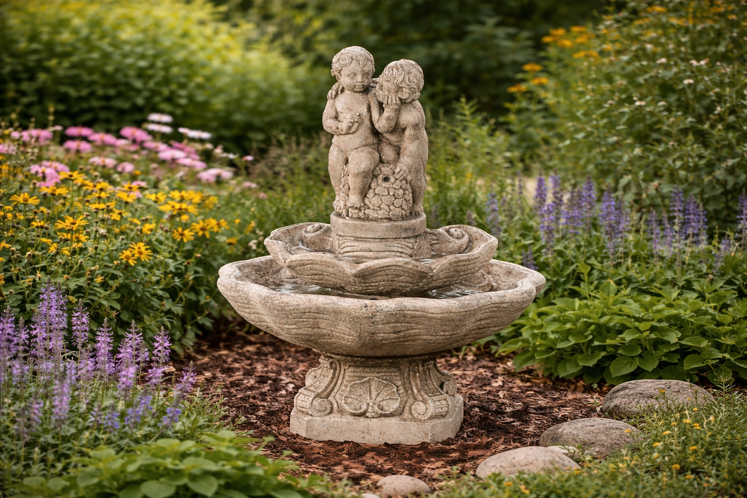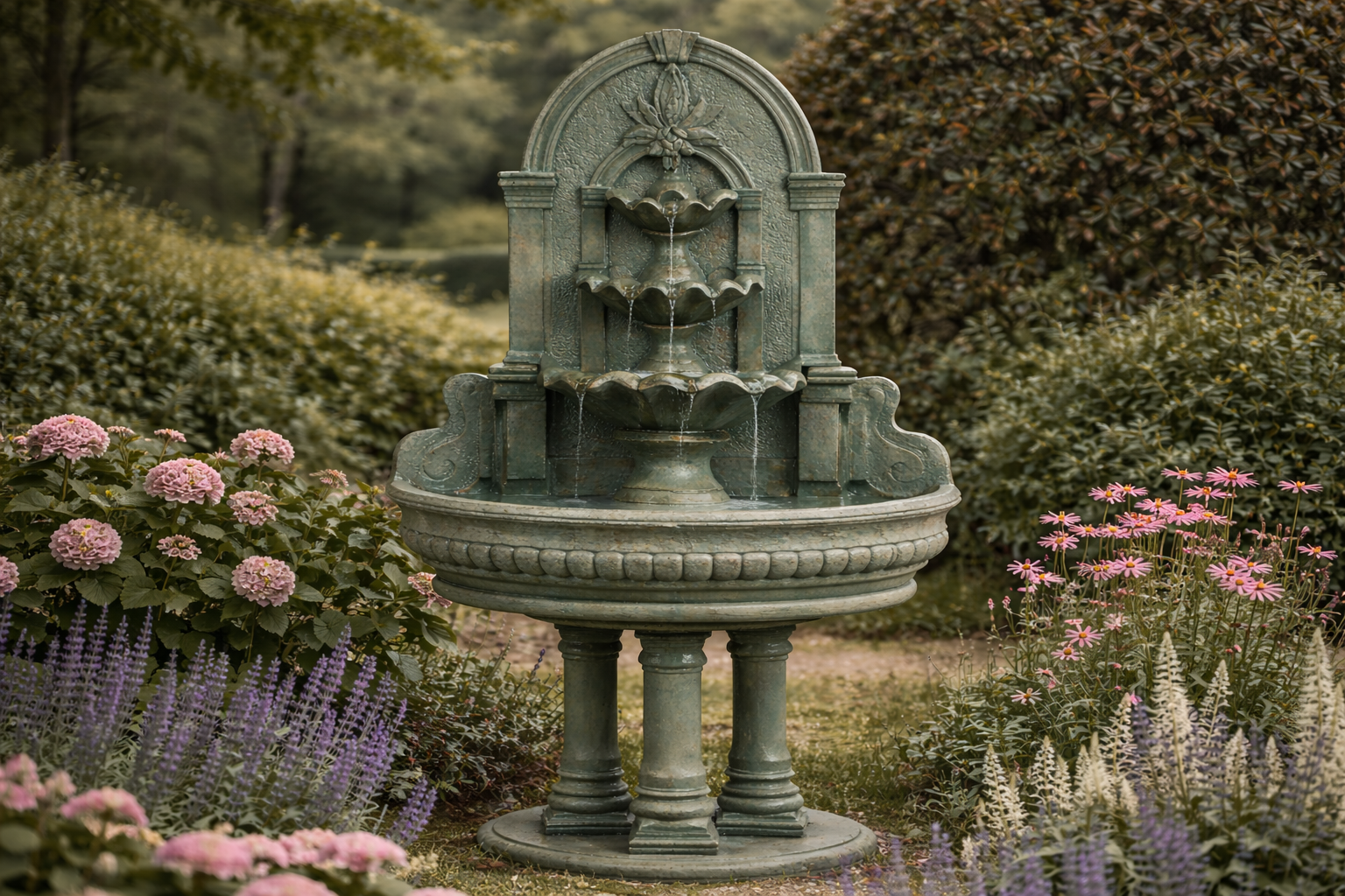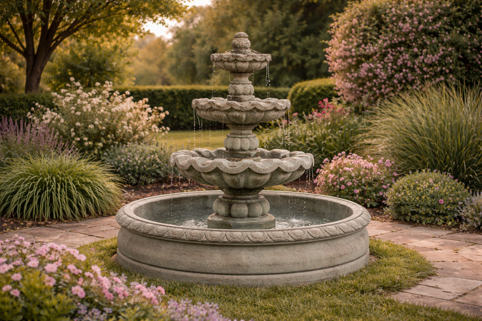 Fountains blend beautifully into garden settings, especially when surrounded by plants, flowers, or stone pathways.